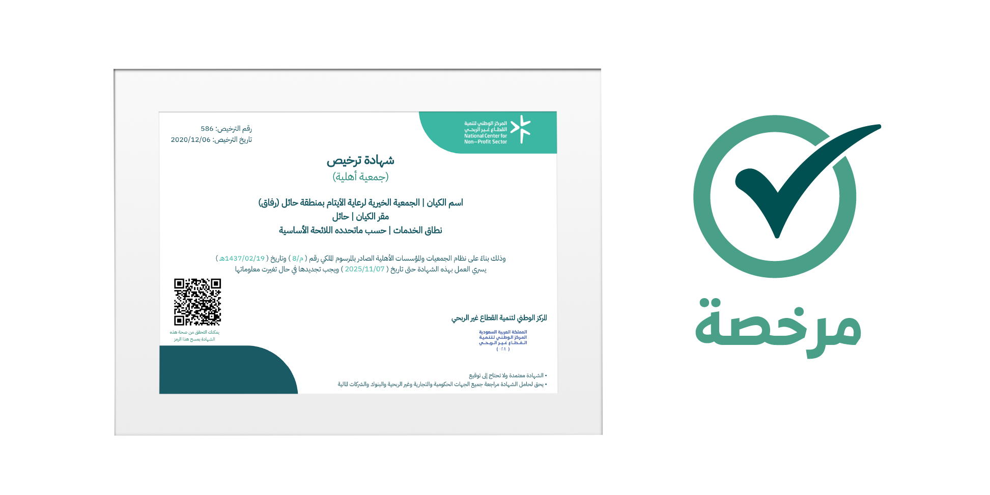 جمعية خيرية مرخصة من المركز الوطني لتنمية القطاع الغير ربحي برقم 586 برخصة رقم 8239